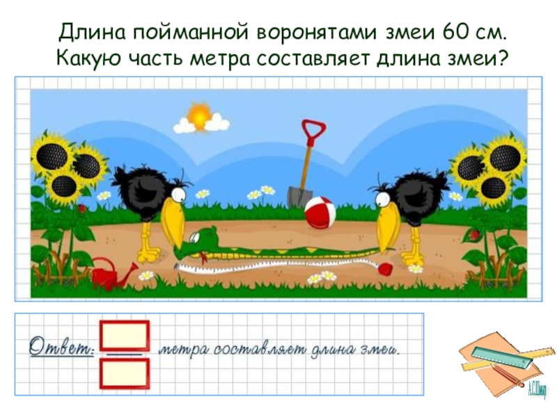 Слайд 6Длина пойманной воронятами змеи 60 см. Какую часть метра составляет длина