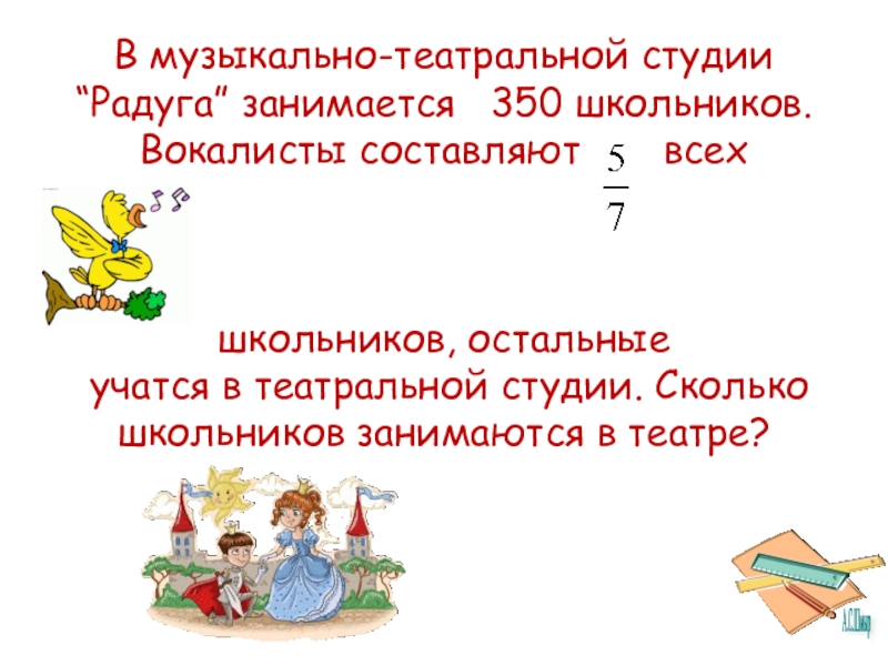 Слайд 10В музыкально-театральной студии “Радуга” занимается 350 школьников. Вокалисты составляют