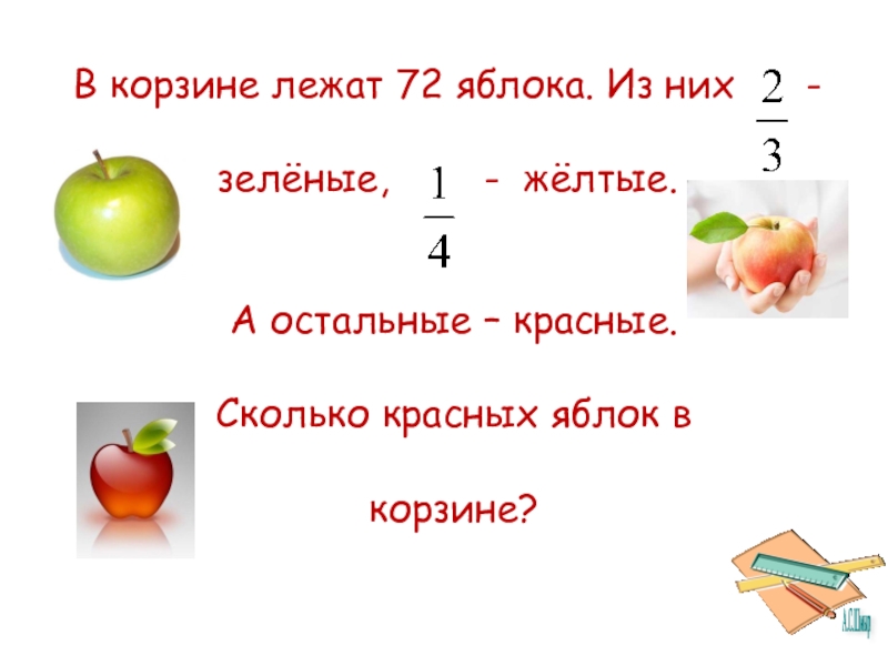 Слайд 12В корзине лежат 72 яблока. Из них - зелёные,
