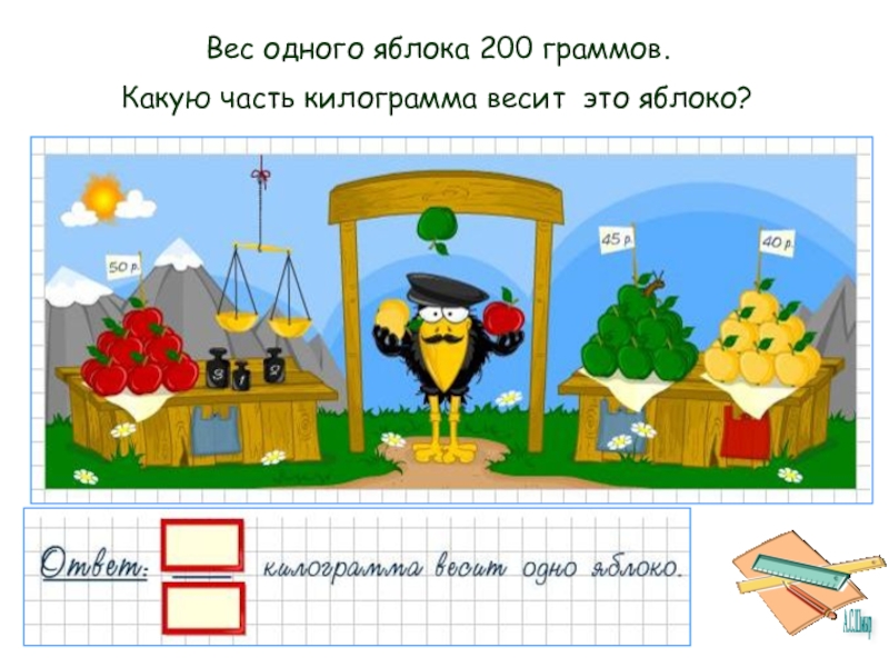 Вес одного яблока 200 граммов.Какую часть килограмма весит это яблоко?
