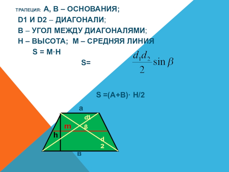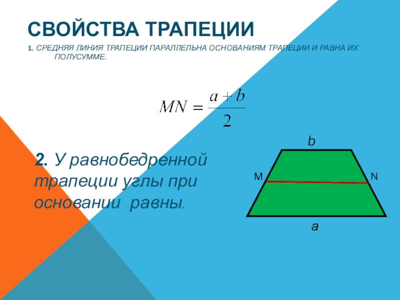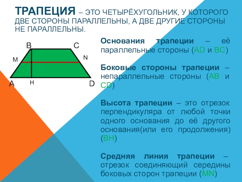 Средняя линия трапеции – отрезок соединяющий середины боковых сторон трапеции (MN)