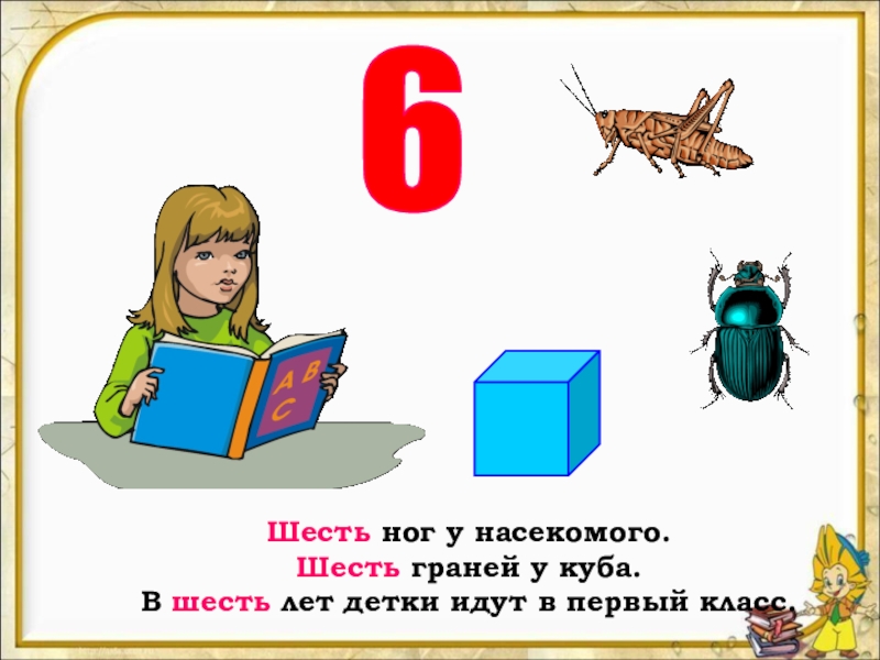 Слайд 10Шесть ног у насекомого. Шесть граней у куба. В шесть лет детки идут