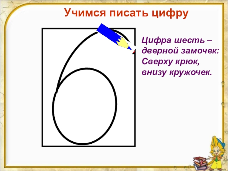 Учимся писать цифруЦифра шесть – дверной замочек:Сверху крюк, внизу кружочек.