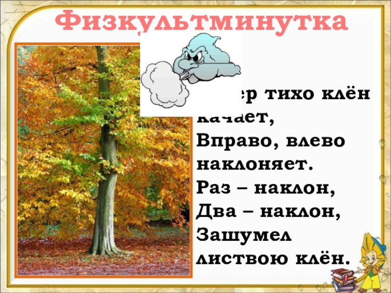 ФизкультминуткаВетер тихо клён качает,Вправо, влево наклоняет.Раз – наклон,Два – наклон,Зашумел листвою клён.
