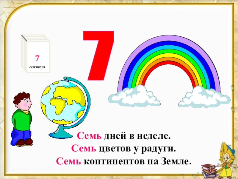 Семь дней в неделе.  Семь цветов у радуги. Семь континентов на Земле.77сентября