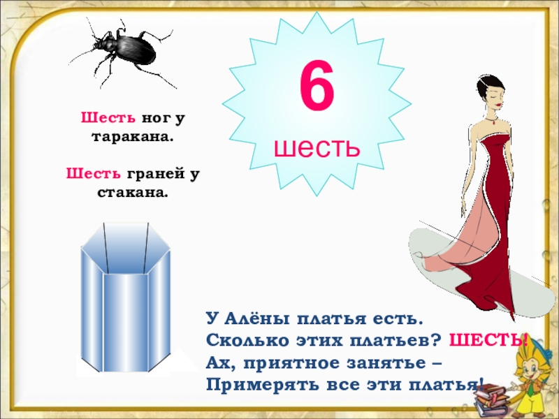 Шесть ног у таракана.  Шесть граней у стакана.6шестьУ Алёны платья есть. Сколько этих платьев? ШЕСТЬ! Ах,