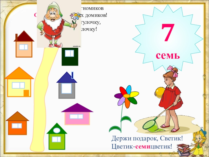 Построили семь гномиков Семь разноцветных домиков! И вышли на прогулочку,  Любуются на улочку!7семьДержи подарок, Светик! Цветик-семицветик!