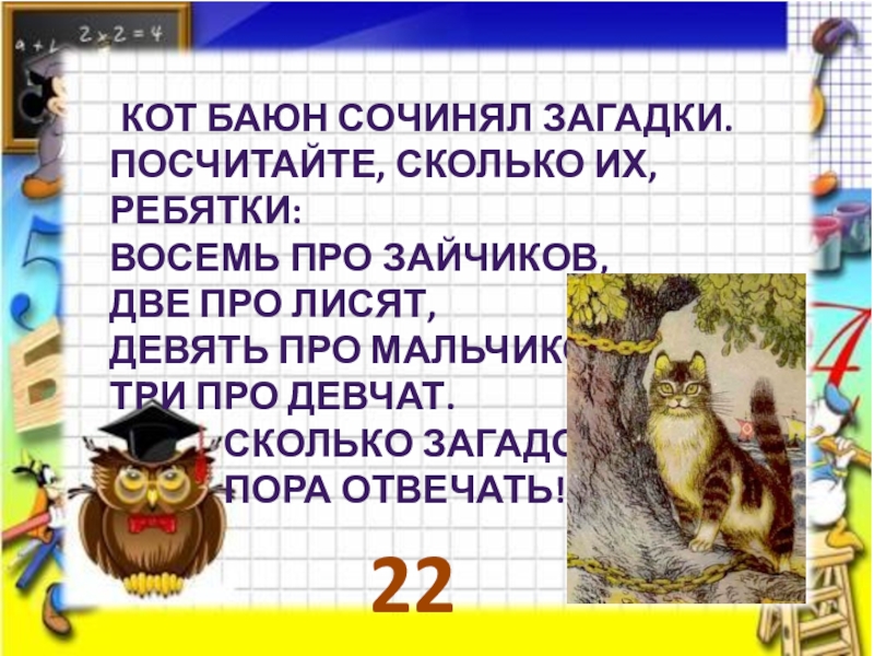 Кот Баюн сочинял загадки. Посчитайте, сколько их, ребятки: Восемь про зайчиков, Две про лисят, Девять про мальчиков,