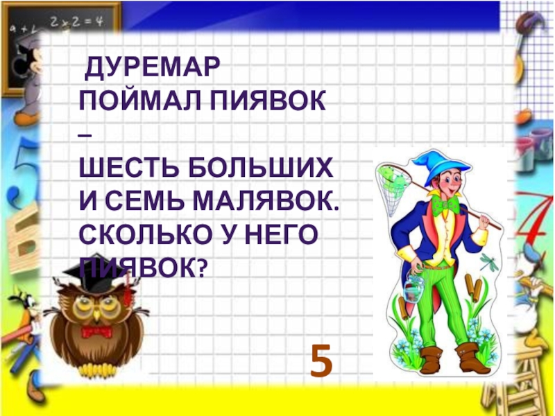 Слайд 12 Дуремар поймал пиявок –  Шесть больших и семь малявок. Сколько у него пиявок?