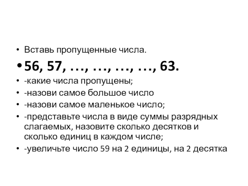 Вставь пропущенные числа.56, 57, …, …, …, …, 63.-какие числа пропущены;-назови самое большое число-назови самое маленькое число;