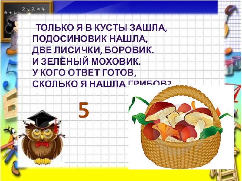 Только я в кусты зашла, Подосиновик нашла, Две лисички, боровик. И зелёный моховик. У кого ответ готов,