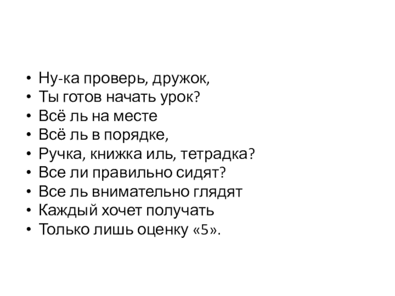 Ну-ка проверь, дружок,Ты готов начать урок?Всё ль на местеВсё ль в порядке,Ручка, книжка иль, тетрадка?Все ли правильно