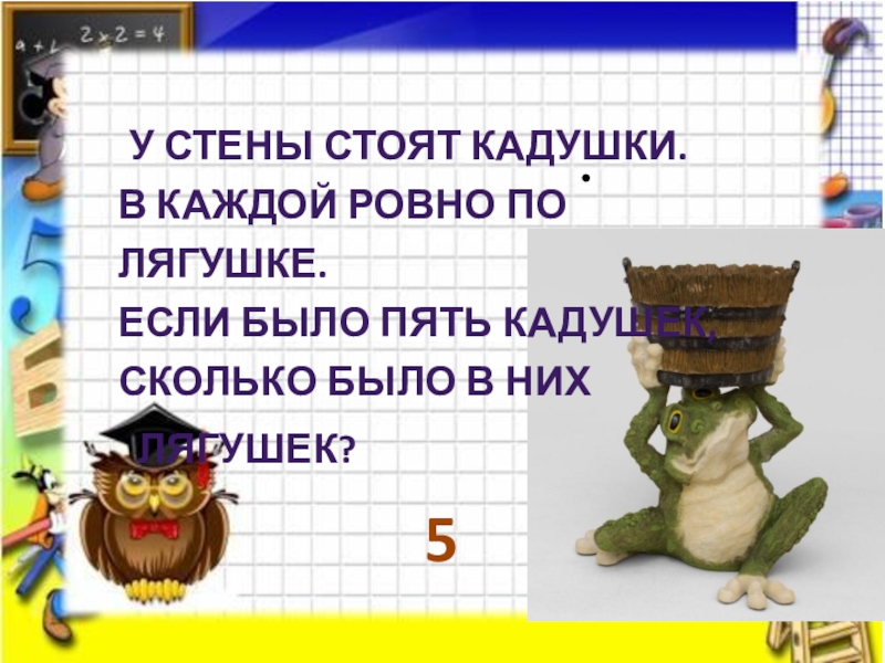 У стены стоят кадушки. В каждой ровно по лягушке. Если было пять кадушек, Сколько было в них