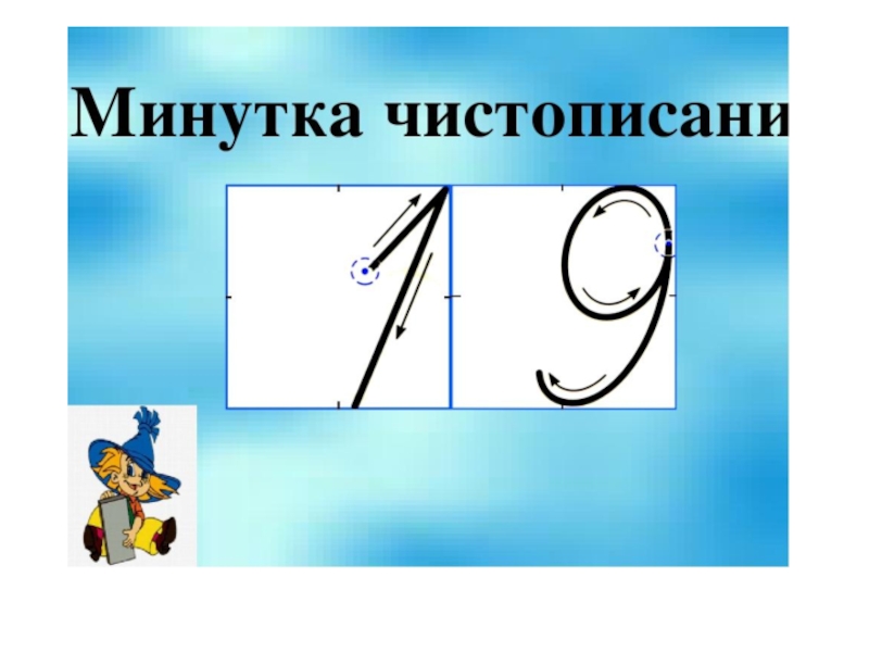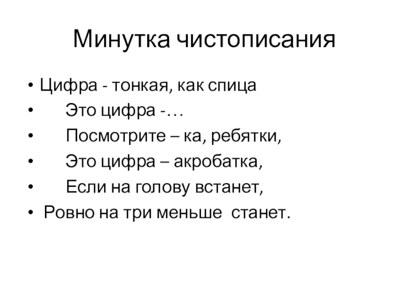 Минутка чистописанияЦифра - тонкая, как спица		Это цифра -… 		Посмотрите – ка, ребятки,		Это цифра – акробатка, 		Если на