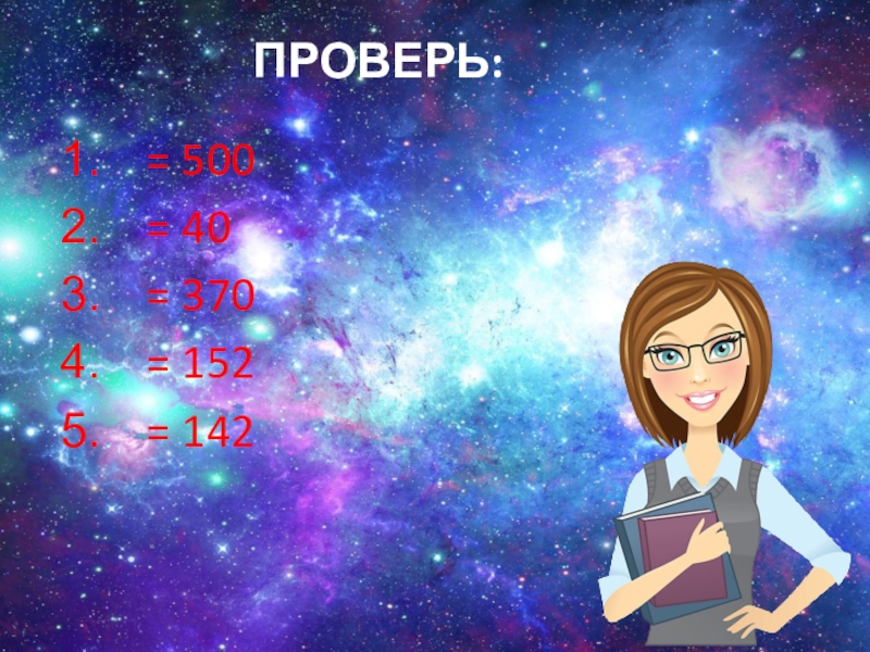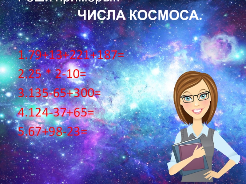 Реши примеры:: 1.79+13+221+187=2.25 * 2-10=3.135-65+300=4.124-37+65=5.67+98-23=Числа космоса.