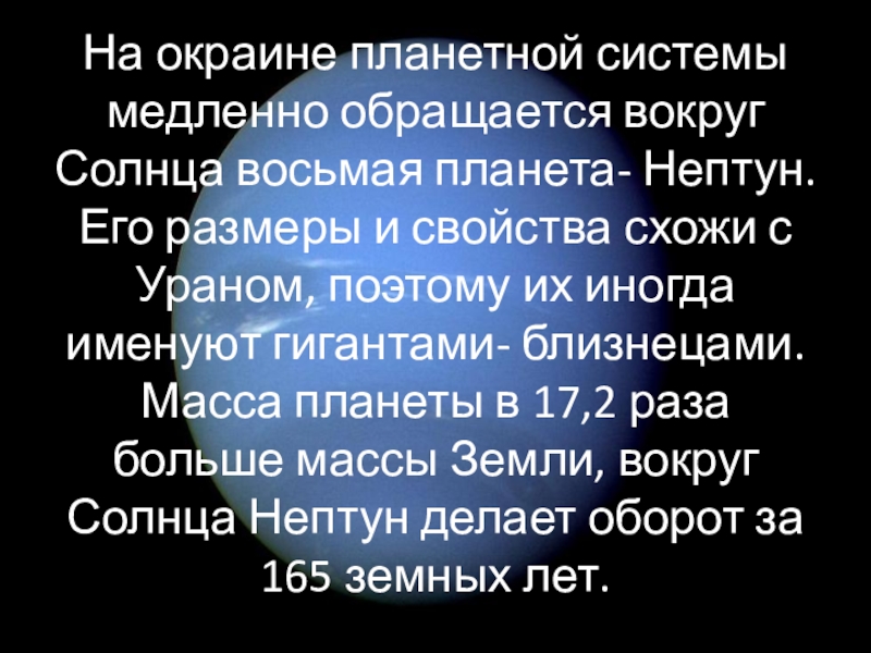 На окраине планетной системы медленно обращается вокруг Солнца восьмая планета- Нептун. Его размеры и свойства схожи с