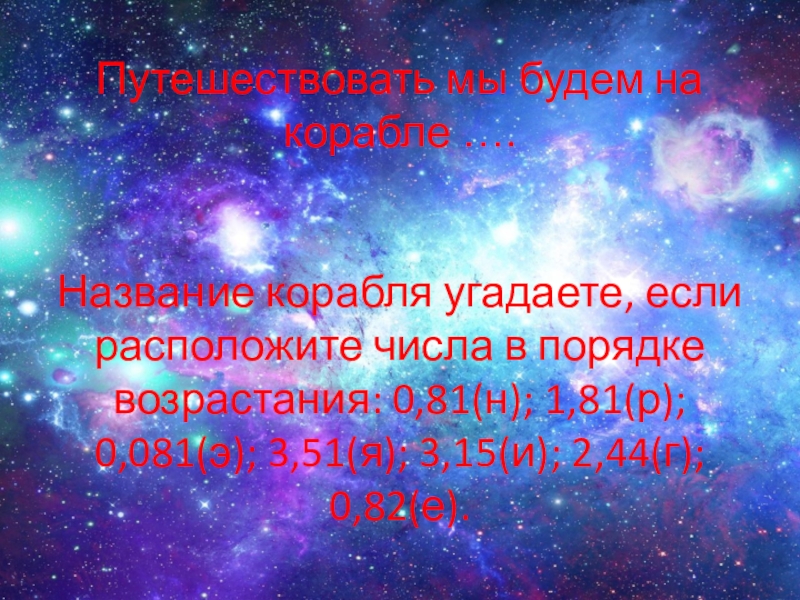 Слайд 4Путешествовать мы будем на корабле …. Название корабля угадаете, если расположите числа