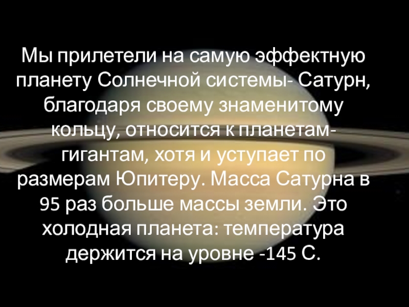Мы прилетели на самую эффектную планету Солнечной системы- Сатурн, благодаря своему знаменитому кольцу, относится к планетам- гигантам,