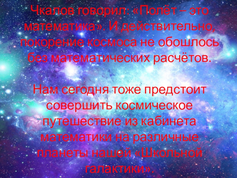 Слайд 3Чкалов говорил: «Полёт – это математика». И действительно, покорение космоса не