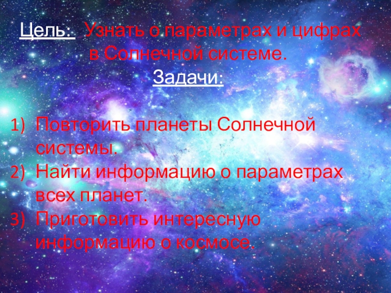 Цель: Узнать о параметрах и цифрах в Солнечной системе.Задачи: Повторить планеты Солнечной системы.Найти информацию о параметрах всех планет.Приготовить интересную информацию о космосе.