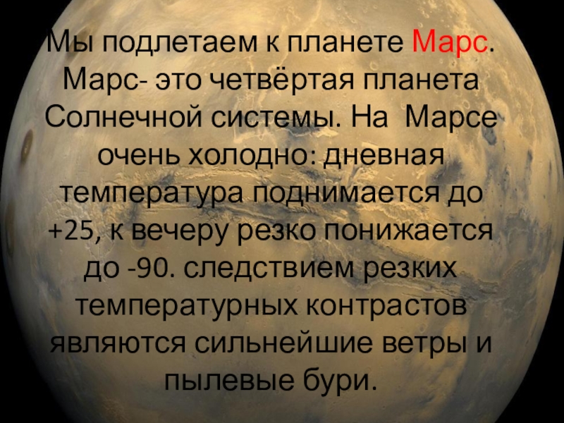 Мы подлетаем к планете Марс. Марс- это четвёртая планета Солнечной системы. На Марсе очень холодно: дневная температура