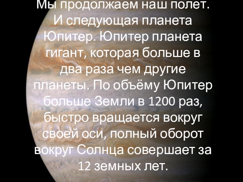 Слайд 7Мы продолжаем наш полёт. И следующая планета Юпитер. Юпитер планета гигант,