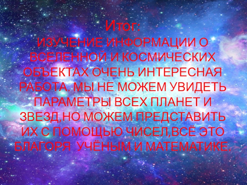 Итог: ИЗУЧЕНИЕ ИНФОРМАЦИИ О ВСЕЛЕННОЙ И КОСМИЧЕСКИХ ОБЪЕКТАХ ОЧЕНЬ ИНТЕРЕСНАЯ РАБОТА. МЫ НЕ МОЖЕМ УВИДЕТЬ ПАРАМЕТРЫ ВСЕХ