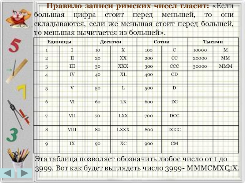 Эта таблица позволяет обозначить любое число от 1 до 3999. Вот как будет выглядеть число 3999- МММСМХС1Х.