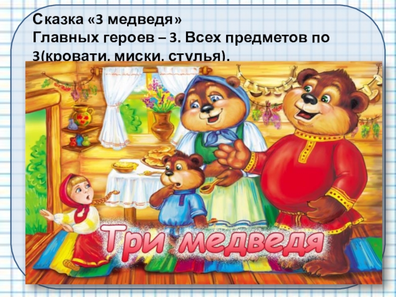 Сказка «3 медведя»Главных героев – 3. Всех предметов по 3(кровати, миски, стулья).