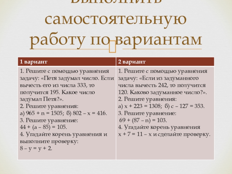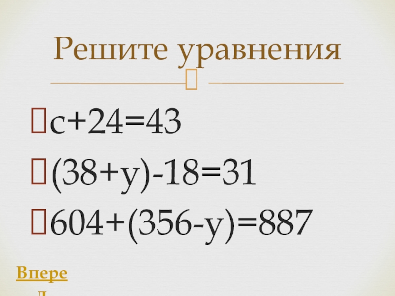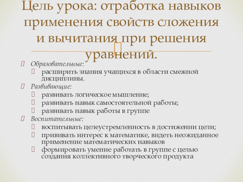 Цель урока: отработка навыков применения свойств сложения и вычитания при решения уравнений.