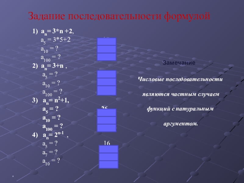 1; ___; 81; ___; 625; … 5; ___; ___; ___; 9; … ___; ___; 3; 11; ___;