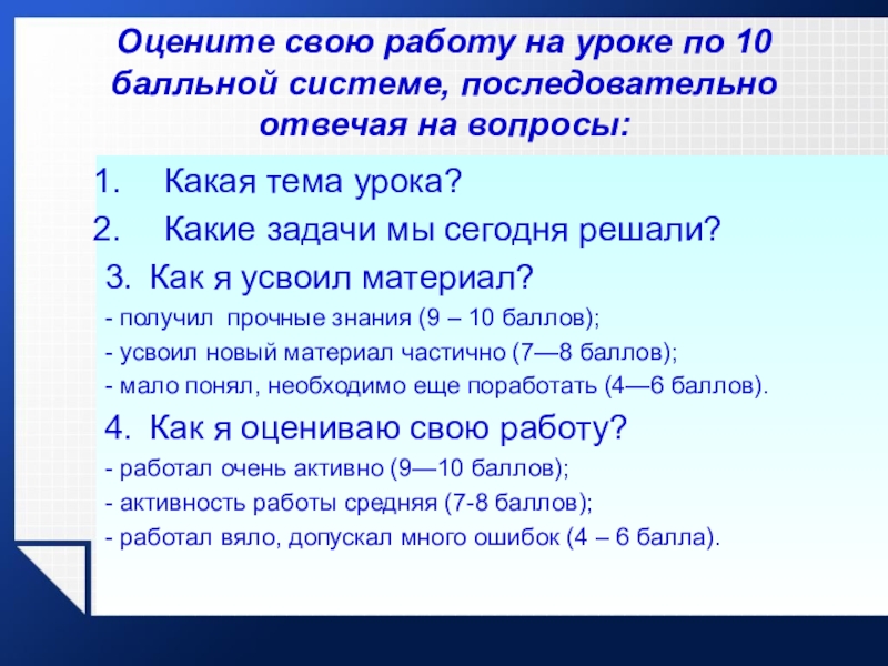 - мало понял, необходимо еще поработать (4—6 баллов).