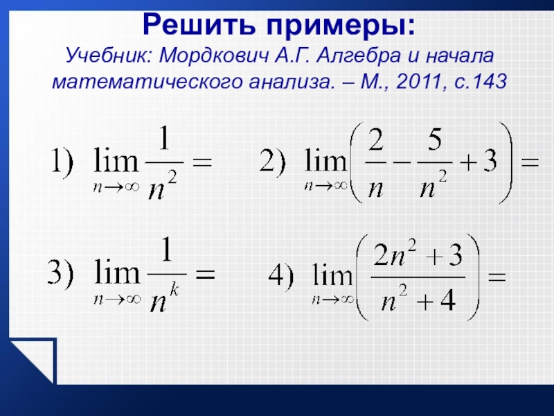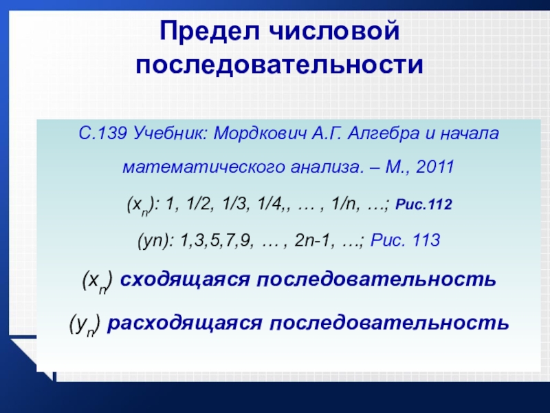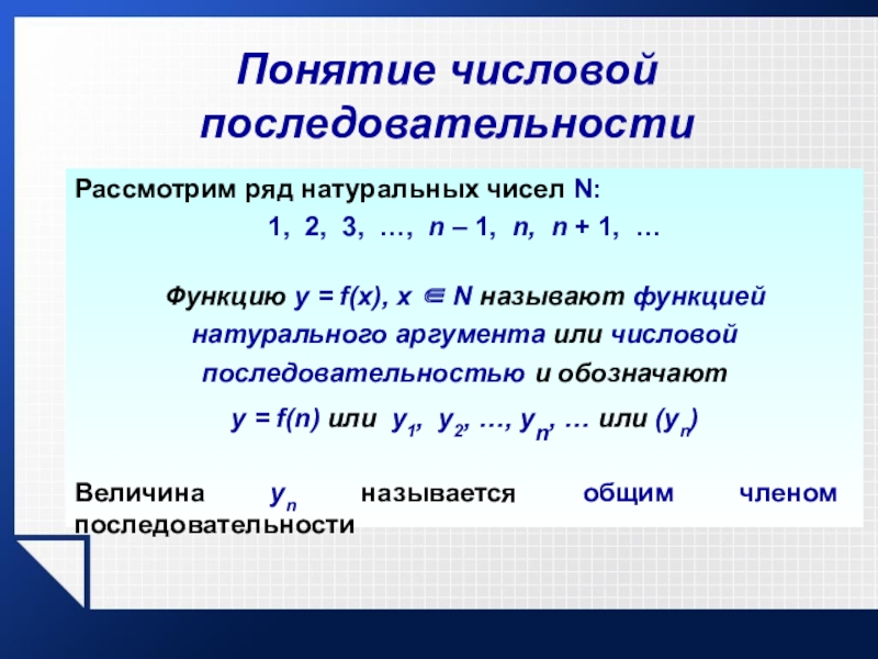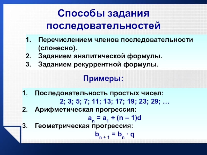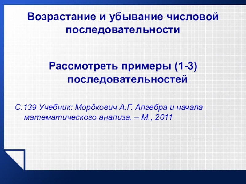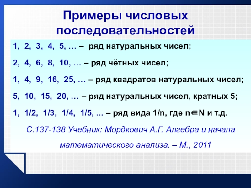 Пример: 1, 1/3, 1/5, 1/7, 1/(2n–1), … - убывающая последовательность.