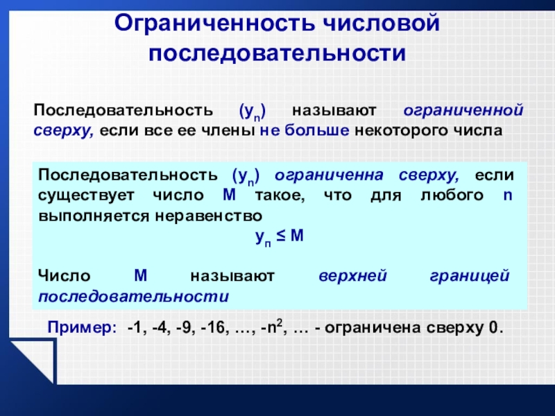 Пример: -1, -4, -9, -16, …, -n2, … - ограничена сверху 0.