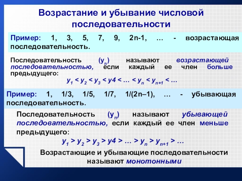 Пример: 1, 3, 5, 7, 9, 2n-1, … - возрастающая последовательность.