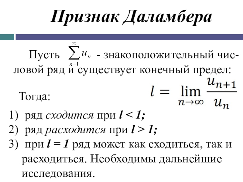 при l = 1 ряд может как сходиться, так и расходиться. Необходимы дальнейшие исследования.