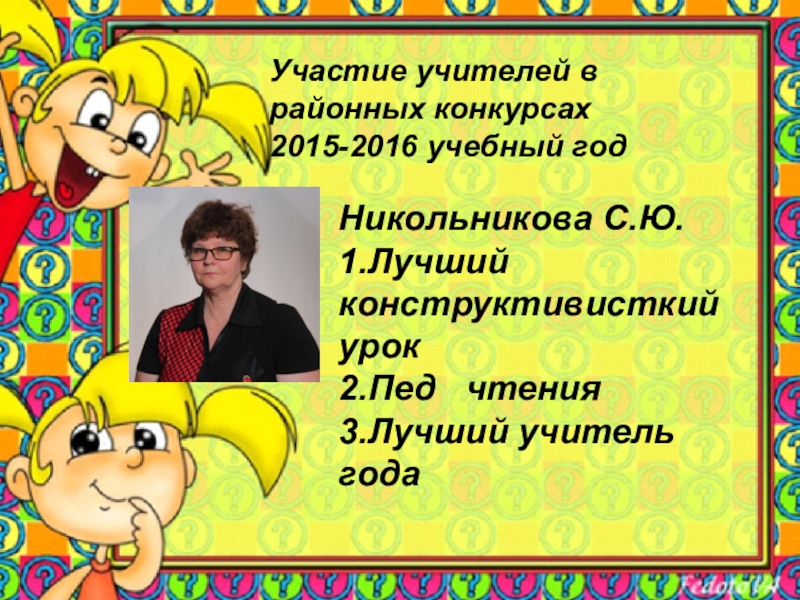 Участие учителей в районных конкурсах 2015-2016 учебный годНикольникова С.Ю.1.Лучший конструктивисткий урок2.Пед  чтения3.Лучший учитель года