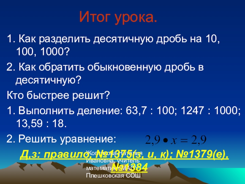правило и выполнять деление десятичной дроби на единицу с последующими нулями, обращать обыкновенную дробь в десятичную.