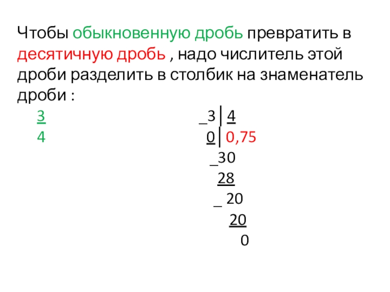 Чтобы обыкновенную дробь превратить в десятичную дробь , надо числитель этой дроби разделить в столбик на знаменатель