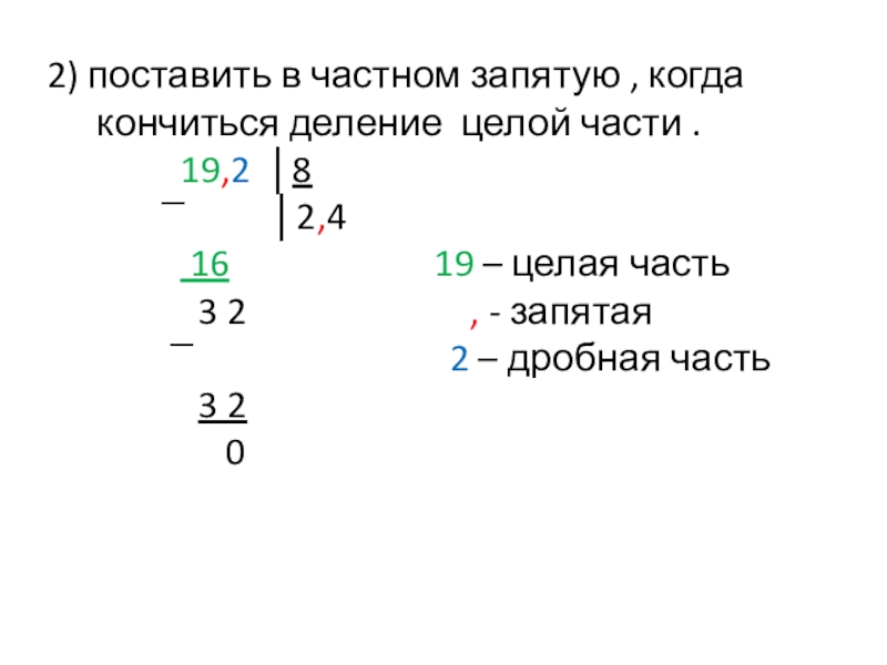 Слайд 32) поставить в частном запятую , когда кончиться деление целой части