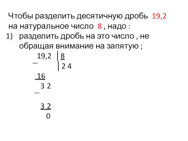 Чтобы разделить десятичную дробь 19,2 на натуральное число 8 , надо :разделить дробь на это число , не обращая внимание на запятую ; 19,2 │8