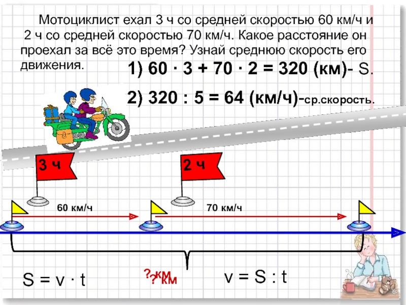 1) 60 ∙ 3 + 70 ∙ 2 = 320 (км)- S.