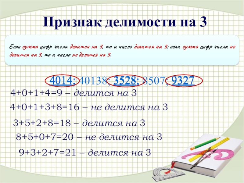 Если сумма цифр числа делится на 3, то и число делится на 3; если сумма цифр числа не делится на 3, то и число не делится на 3.