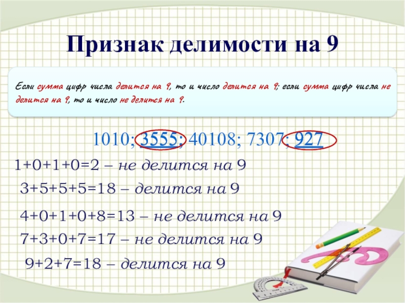 Если сумма цифр числа делится на 9, то и число делится на 9; если сумма цифр числа не делится на 9, то и число не делится на 9.