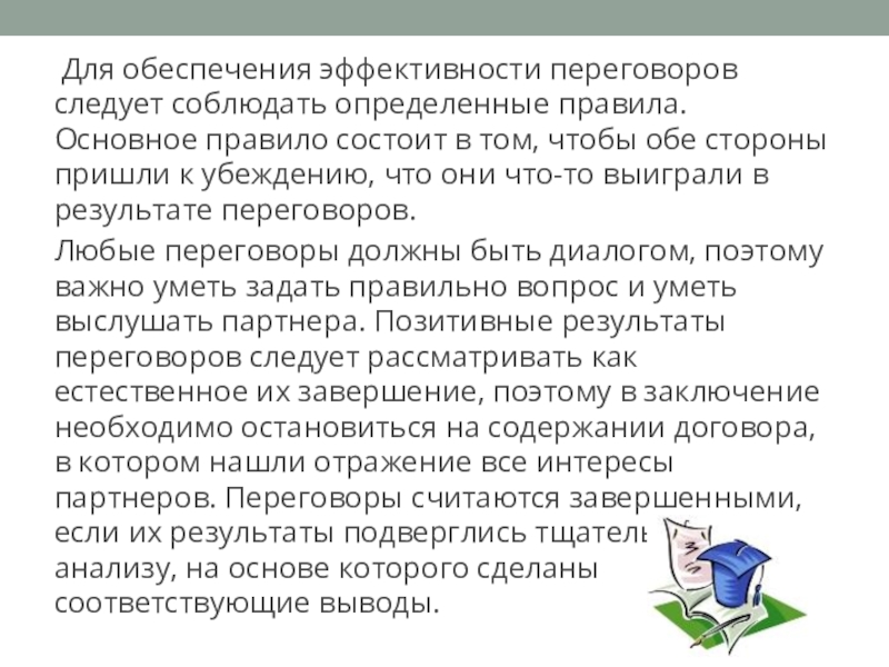 Слайд 13 Для обеспечения эффективности переговоров следует соблюдать определенные правила. Основное правило состоит