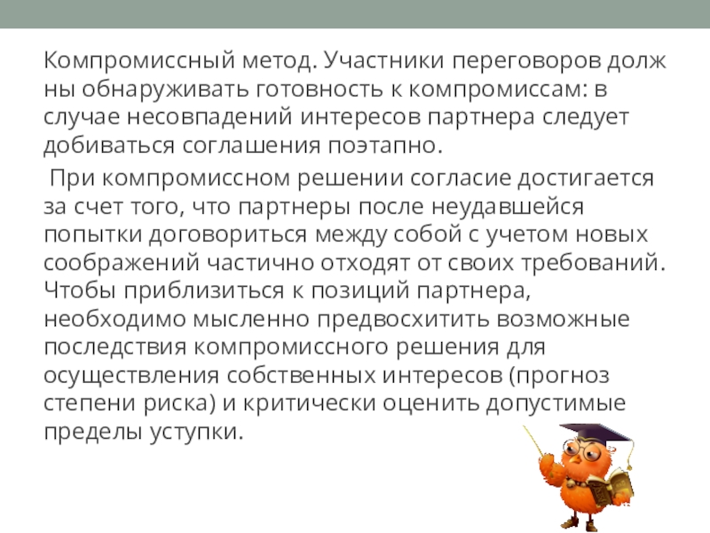 Слайд 10Компромиссный метод. Участники переговоров должны обнаруживать готовность к компромиссам: в случае