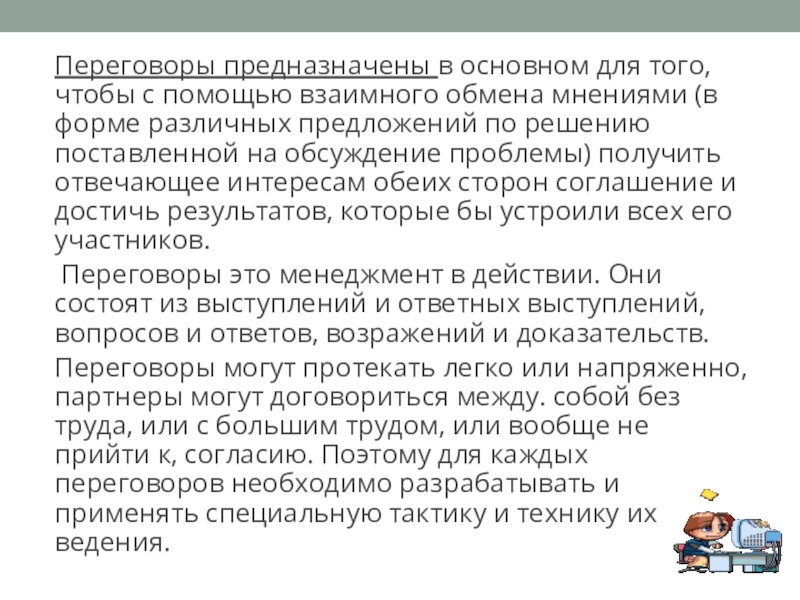 Слайд 3Переговоры предназначены в основном для того, чтобы с помощью взаимного обмена