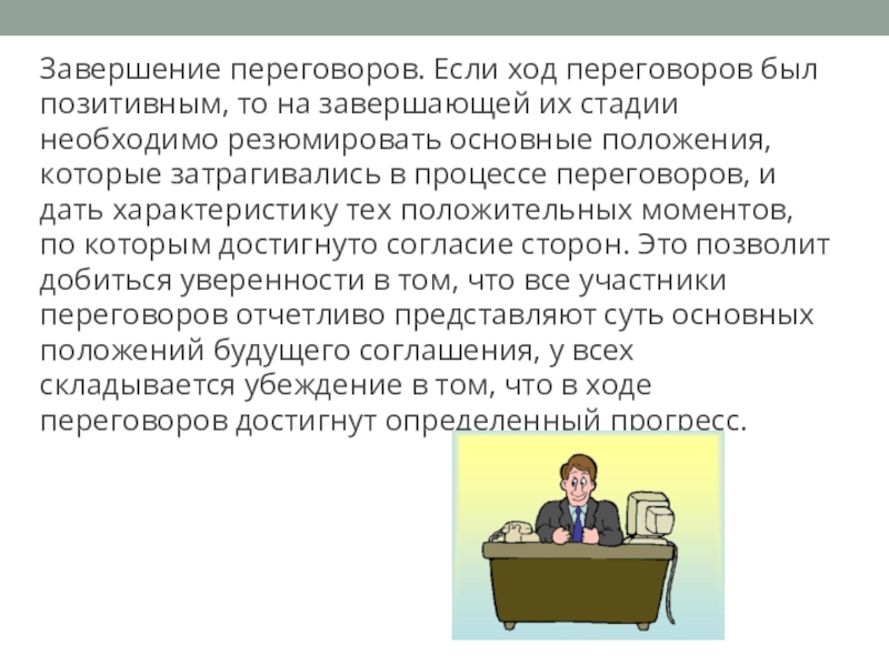 Слайд 11Завершение переговоров. Если ход переговоров был позитивным, то на завершающей их