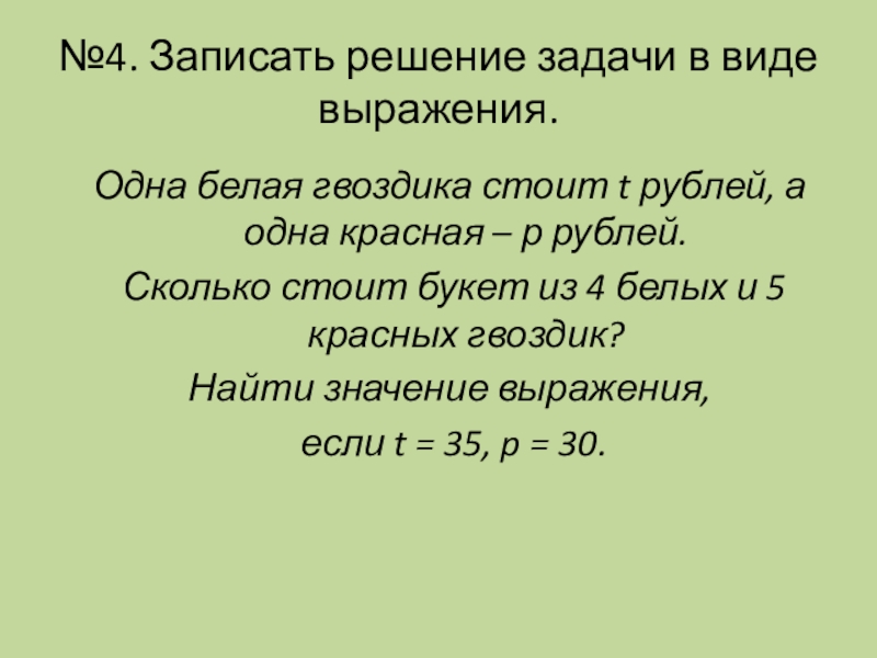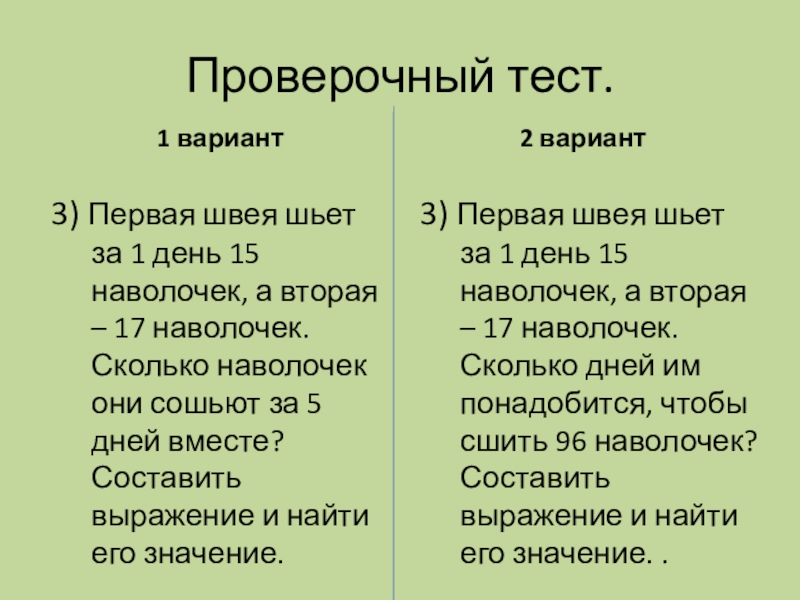 3) Первая швея шьет за 1 день 15 наволочек, а вторая – 17 наволочек. Сколько наволочек они сошьют за 5 дней вместе? Составить выражение и найти его значение.