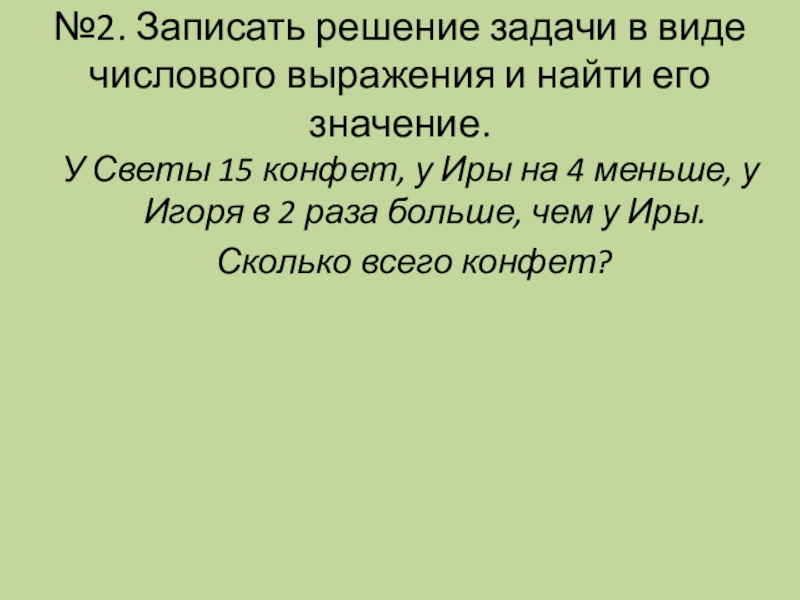 У Светы 15 конфет, у Иры на 4 меньше, у Игоря в 2 раза больше, чем у Иры.